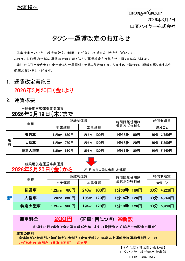 ホーム > お知らせ newsお知らせ 運賃改定のお知らせ(2026年3月20日改定) 投稿日 2026.03.07(お知らせ) WHAT'S NEW 運賃改定のお知らせ(2026年3月20日改定) 山交バス株式会社との合併および商号変更のお知らせ 天童地区 営業時間変更のお知らせ(2026年1月1日から) 地域密着型配車アプリ「きてけろTaxi」のサービス開始のお知らせ カスタマーハラスメントに関する対応方針について CATEGORY お知らせ スタッフブログ 採用情報 未分類 観光案内 タクシー配車受付はこちら 山形地区タクシー受付/ 24時間 TEL :023-681-1515はい, いこういこう TEL :023-684-1515はよ, いこういこう 蔵王地区タクシー受付/ 24時間 TEL :023-694-9611 上山地区タクシー受付/ 7:00〜18:45 TEL :023-672-1616 天童地区タクシー受付/ 6:30〜20:00 TEL :023-654-2525 貸切ハイヤー受付/ 平日9:00〜17:00 TEL :023-615-9333 福祉タクシー受付/ 平日9:00〜17:00 TEL :023-684-1513 ※蔵王地区はお時間を頂く場合がございます。
